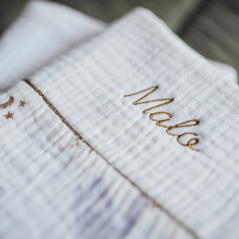 - Le prénom de votre bébé brodé (à la couleur de notre choix ou dites-nous si vous avez une préférence)